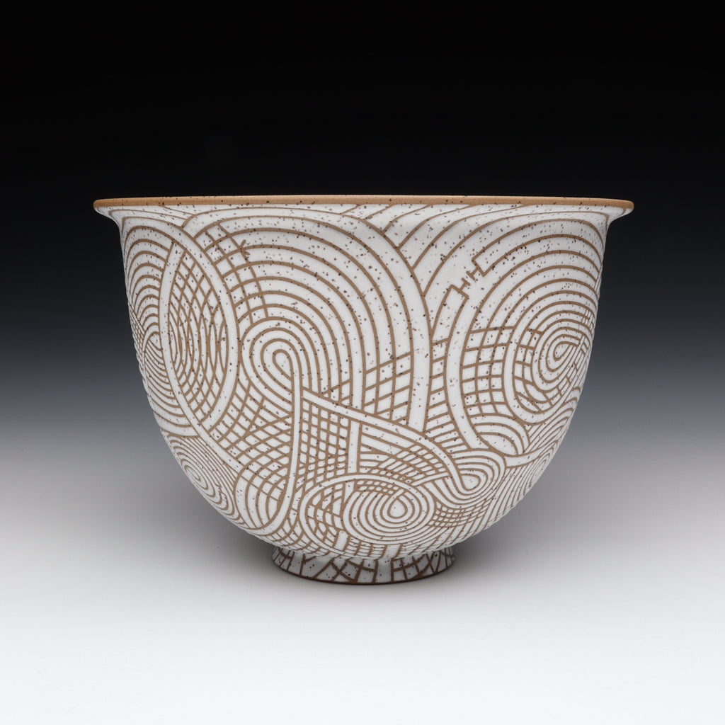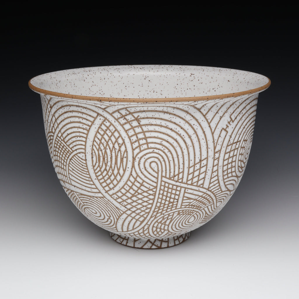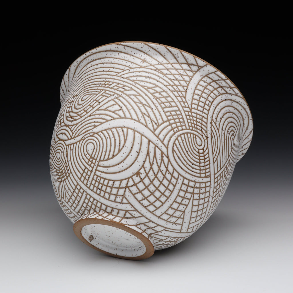 I threw this piece on my pottery wheel using stoneware clay. After letting the piece slowly dry to a "leather-hard" state, I refined the final shape on the wheel with a variety of pottery trimming tools. After another period of slow-drying over several days until the piece becomes "bone dry," it was bisque-fired (a lower-temperature firing that allows me to handle the piece without it easily breaking, but still porous enough to absorb glaze for the final firing). The design was applied free-hand by meticulously taping the surface over many (many) hours. A ceramic glaze was applied to the taped surface, dried overnight, tape removed, glaze line edges refined, and a final cleanup on the foot and any other areas I didn't want glaze ...and then the piece was fired in a ceramic kiln to over 2,100F (1,100C).