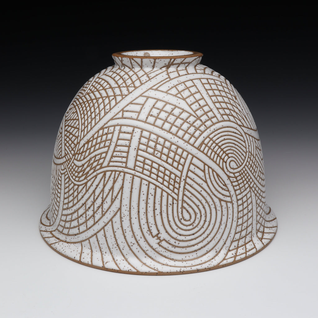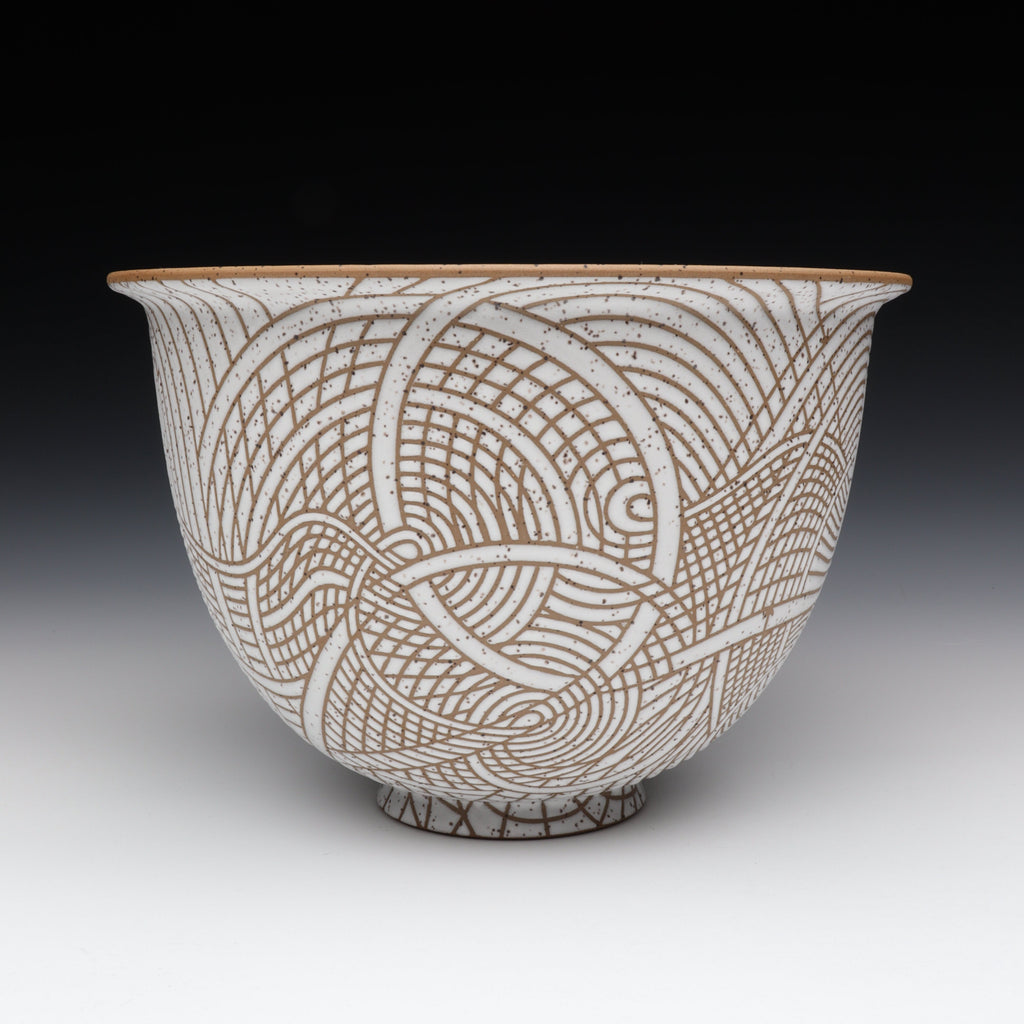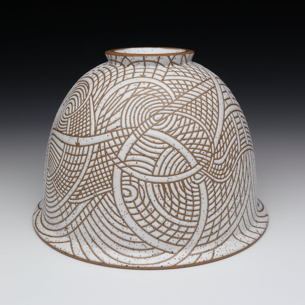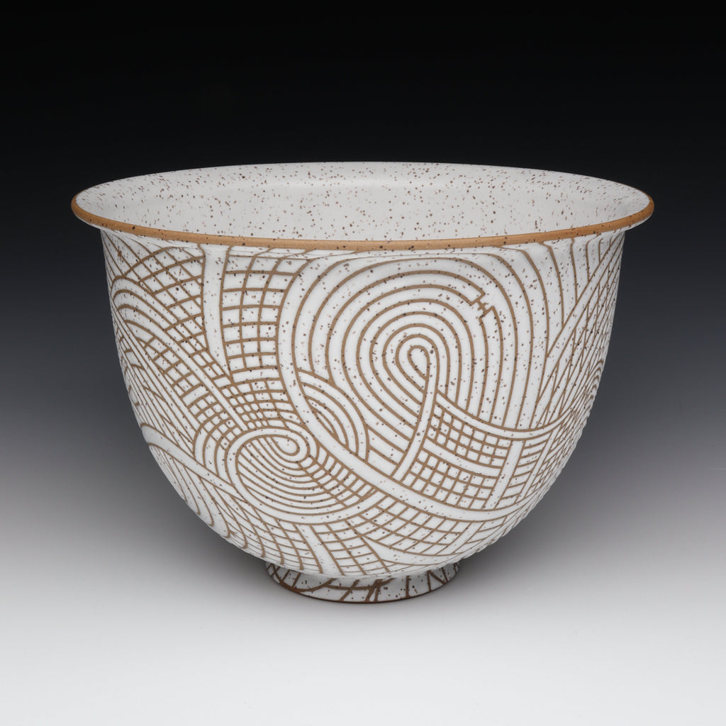 I threw this piece on my pottery wheel using stoneware clay. After letting the piece slowly dry to a "leather-hard" state, I refined the final shape on the wheel with a variety of pottery trimming tools. After another period of slow-drying over several days until the piece becomes "bone dry," it was bisque-fired (a lower-temperature firing that allows me to handle the piece without it easily breaking, but still porous enough to absorb glaze for the final firing). The design was applied free-hand by meticulously taping the surface over many (many) hours. A ceramic glaze was applied to the taped surface, dried overnight, tape removed, glaze line edges refined, and a final cleanup on the foot and any other areas I didn't want glaze ...and then the piece was fired in a ceramic kiln to over 2,100F (1,100C).