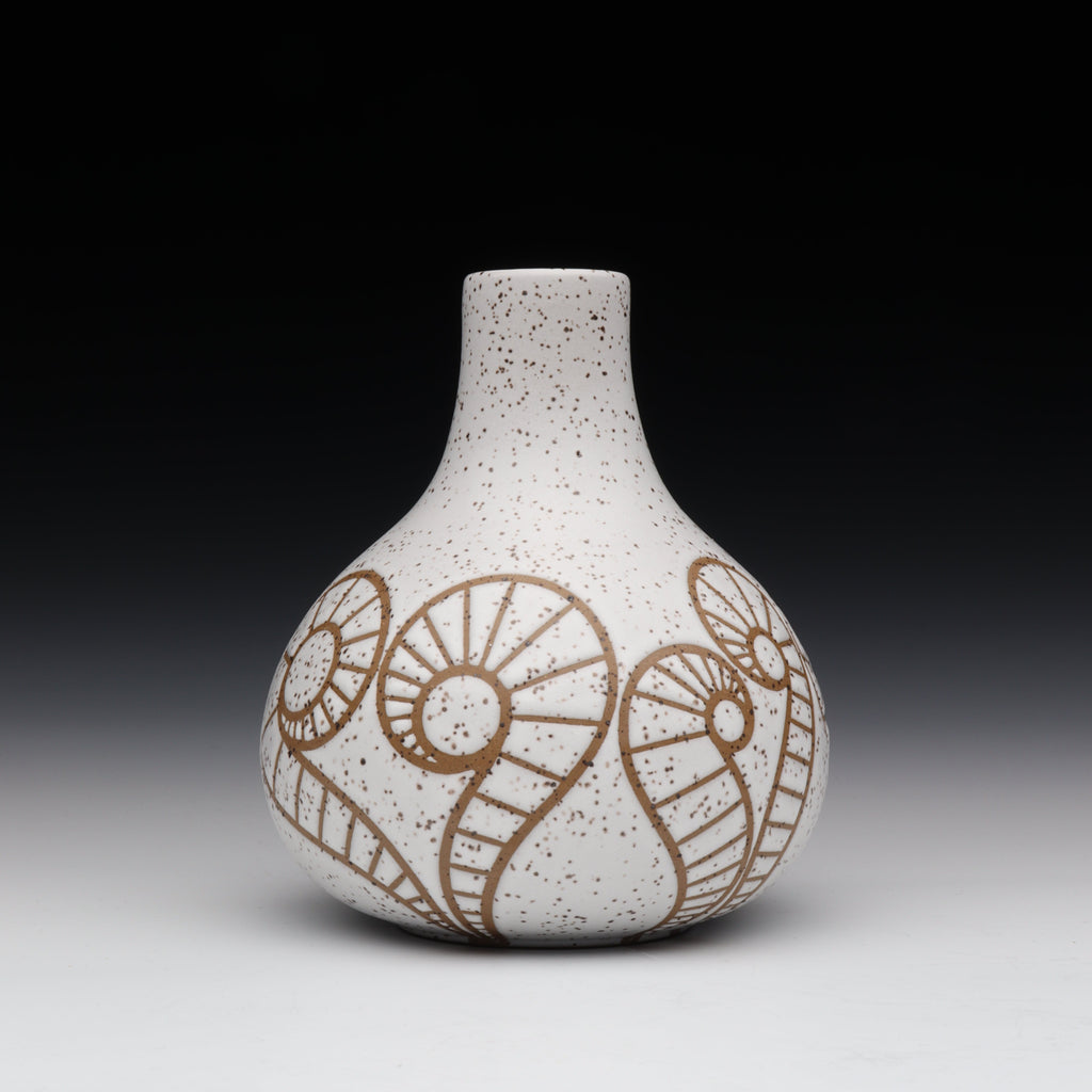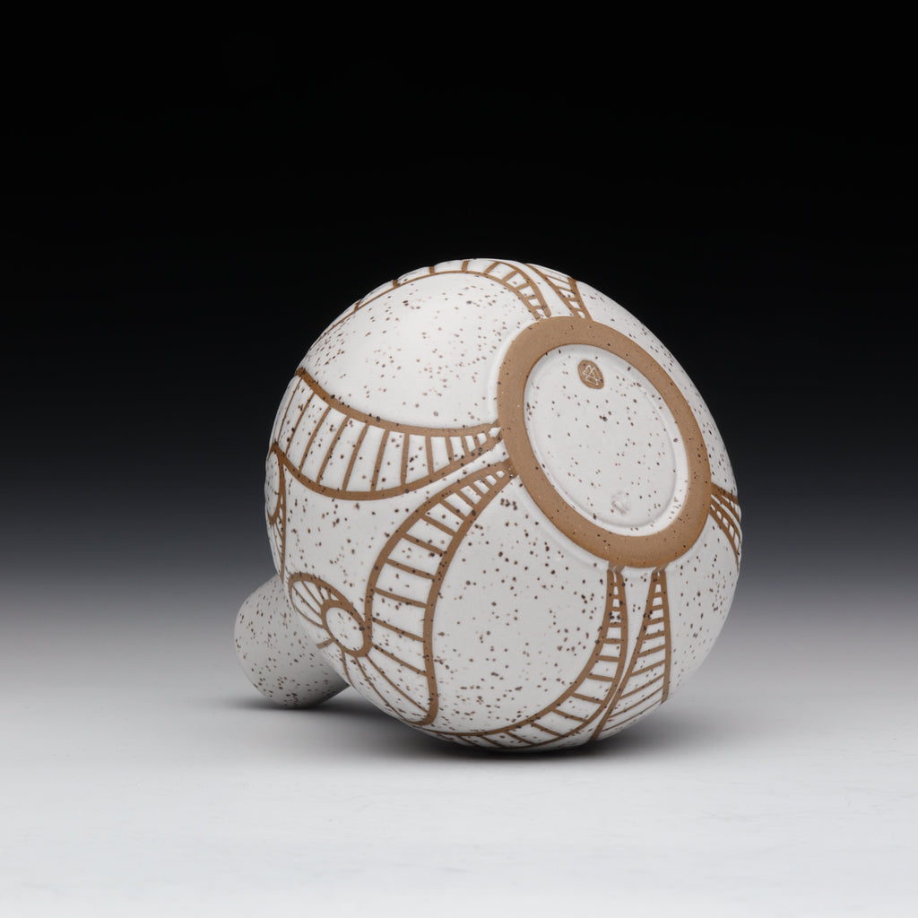 I threw this piece on my pottery wheel using stoneware clay. After letting the piece slowly dry to a "leather-hard" state, I refined the final shape on the wheel with a variety of pottery trimming tools. After another period of slow-drying over several days until the piece becomes "bone dry," it was bisque-fired (a lower-temperature firing that allows me to handle the piece without it easily breaking, but still porous enough to absorb glaze for the final firing). The design was applied free-hand by meticulously taping the surface over many (many) hours. A ceramic glaze was applied to the taped surface, dried overnight, tape removed, glaze line edges refined, and a final cleanup on the foot and any other areas I didn't want glaze ...and then the piece was fired in a ceramic kiln to over 2,100F (1,100C).