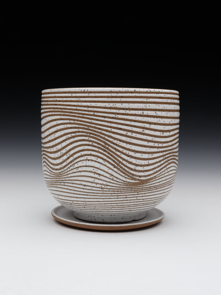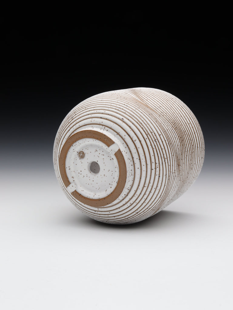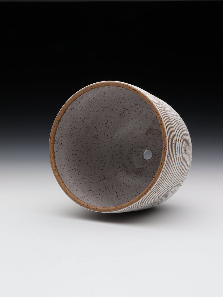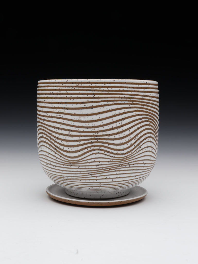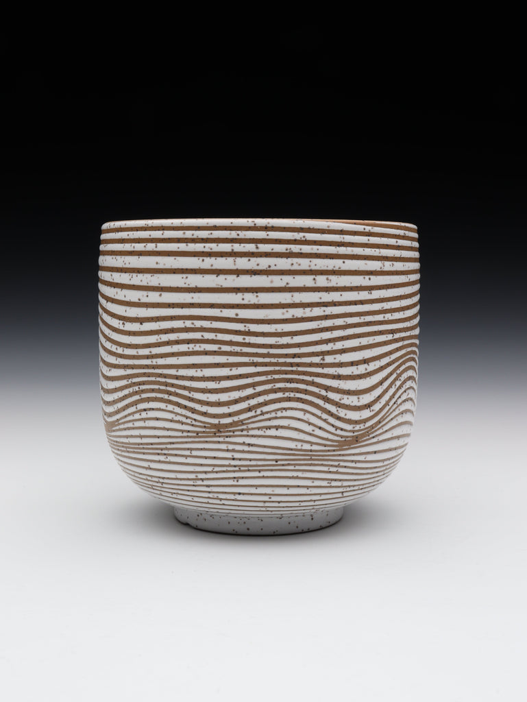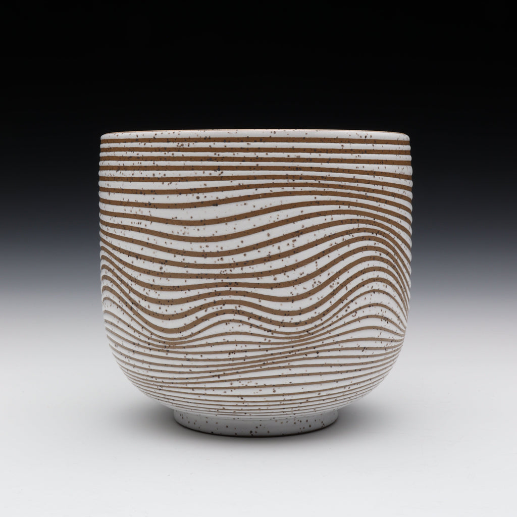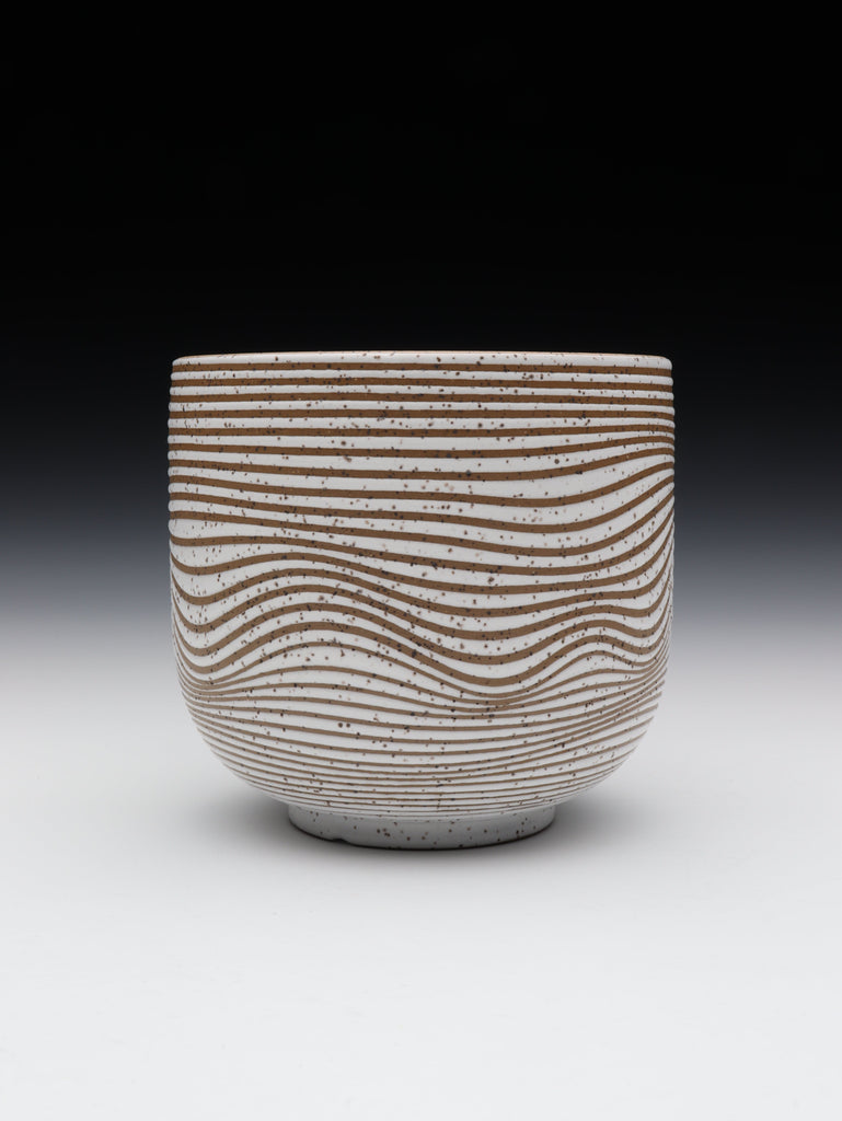 I threw this piece on my pottery wheel using stoneware clay. After letting the piece slowly dry to a "leather-hard" state, I refined the final shape on the wheel with a variety of pottery trimming tools. After another period of slow-drying over several days until the piece becomes "bone dry," it was bisque-fired (a lower-temperature firing that allows me to handle the piece without it easily breaking, but still porous enough to absorb glaze for the final firing). The design was applied free-hand by meticulously taping the surface over many (many) hours. A ceramic glaze was applied to the taped surface, dried overnight, tape removed, glaze line edges refined, and a final cleanup on the foot and any other areas I didn't want glaze ...and then the piece was fired in a ceramic kiln to over 2,100F (1,100C).
